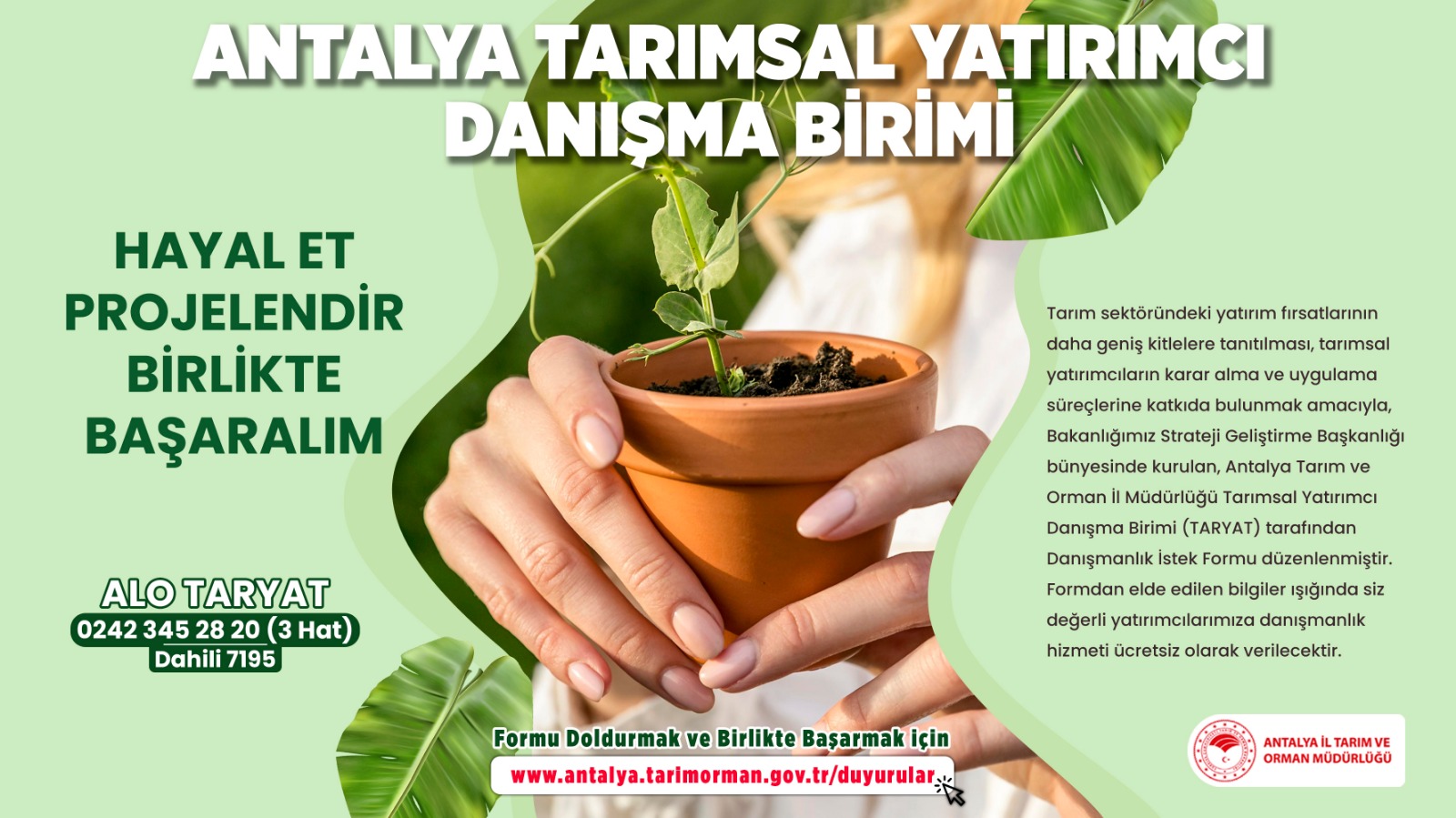 Tarım sektöründeki yatırım fırsatlarının daha geniş kitlelere tanıtılması, tarımsal yatırımcıların karar alma ve uygulama süreçlerine katkıda bulunmak amacıyla, Antalya İl Tarım ve Orman Müdürlüğü bünyesinde Tarımsal Yatırımcı Danışma Birimi (TARYAT) kurulmuştur. Kurulan bu birimimizce siz değerli yatırımcılarımıza ücretsiz danışmanlık hizmeti verilecektir.